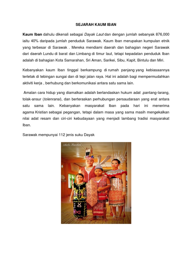 Asal Usul Kaum Iban Kaum Iban atau Kaum Dayak Iban dalam bahasa Iban Iban bermaksud Orang Manusia adalah salah satu rumpun Dayak yang terdapat di Sarawak. Pakaian tradisional iban ada dua iaitu pertama untuk. Bagi pakaian istiadat suku kaum iban lelaki akan memakai baju burung dan.